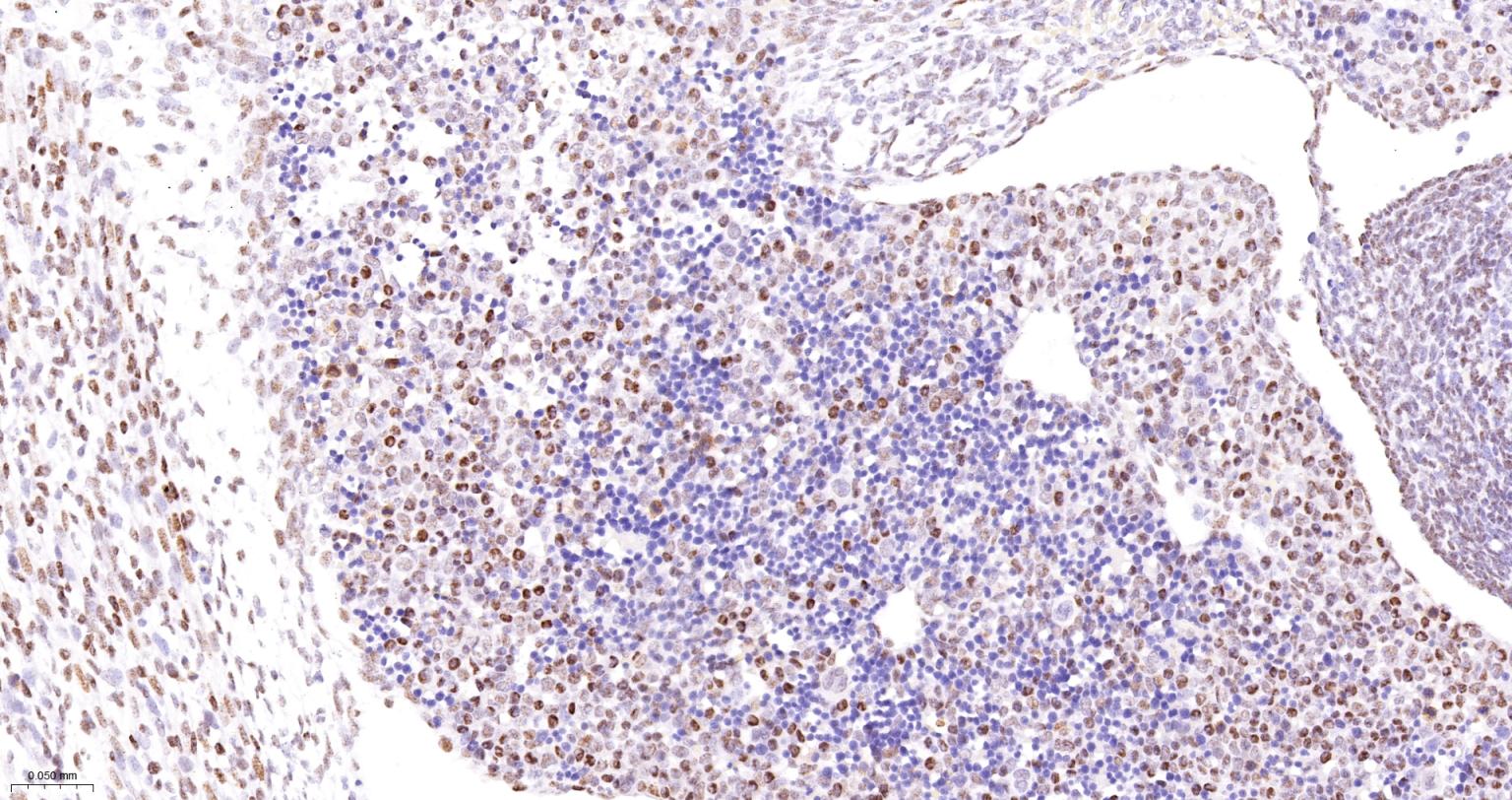 Paraformaldehyde-fixed, paraffin embedded Mouse Thymus; Antigen retrieval by boiling in sodium citrate buffer (pH6.0) for 15 min; The section was incubated with Cyclin H Monoclonal Antibody, Unconjugated (bsm-61446R) at 1:200 overnight at 4°C, followed by conjugation to the bs-0295G-HRP and DAB (C-0010) staining.