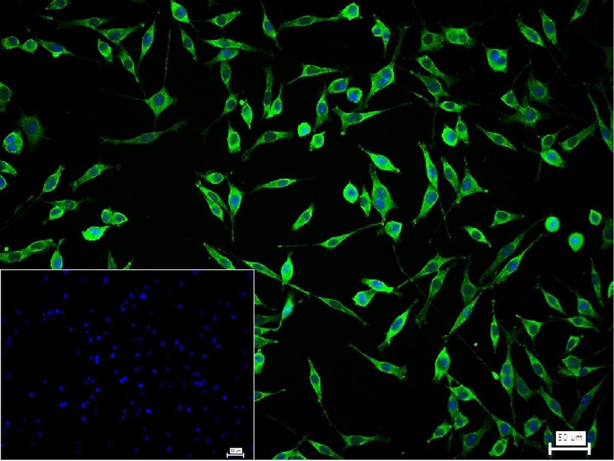 4% Paraformaldehyde-fixed A431 (H) cell; Triton X-100 at r.t. for 20 min; Antibody incubation with (Peroxiredoxin-6) monoclonal Antibody, unconjugated (bsm-61449R) 1:100, 90 min at 37°C; followed by conjugated Goat Anti-Rabbit IgG antibody (green, bs-40295G-FITC) at 37°C for 90 min, DAPI (blue, C02-04002) was used to stain the cell nuclei. PBS instead of the primary antibody was used as the blank control.