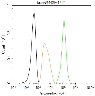 The A431 (H) cells were fixed with 4% PFA (10 min at r.t.) and then permeabilized with 90% ice-cold methanol for 20 min at -20℃,the cells then were incubated in 5%BSA to block non-specific protein-protein interactions (30 min at r.t.).Primary Antibody (green):Rabbit Anti-Peroxiredoxin-6 antibody (bsm-61449R,1:100); Isotype Control (orange): Rabbit IgG (bs-0295P). Blank control (black): PBS. Acquisition of 20,000 events was performed.