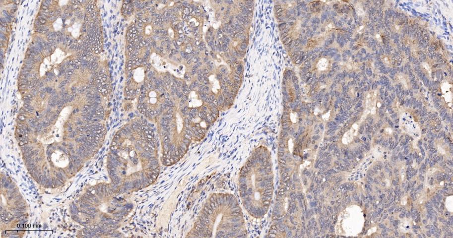 Paraformaldehyde-fixed, paraffin embedded Human Colon Cancer; Antigen retrieval by boiling in sodium citrate buffer (pH6.0) for 15 min; The section was incubated with Bid Monoclonal Antibody, Unconjugated (bsm-61450R) at 1:200 overnight at 4°C, followed by conjugation to the bs-0295G-HRP and DAB (C-0010) staining.