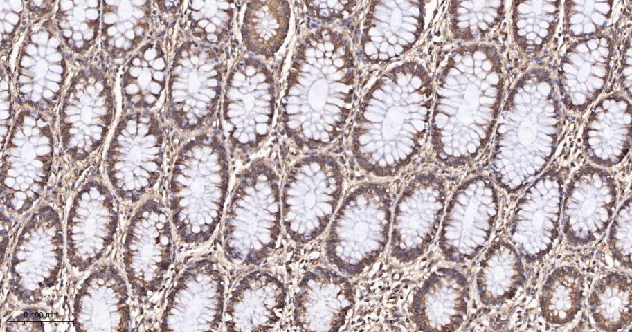 Paraformaldehyde-fixed, paraffin embedded Human Colon; Antigen retrieval by boiling in sodium citrate buffer (pH6.0) for 15 min; The section was incubated with Bid Monoclonal Antibody, Unconjugated (bsm-61450R) at 1:200 overnight at 4°C, followed by conjugation to the bs-0295G-HRP and DAB (C-0010) staining.