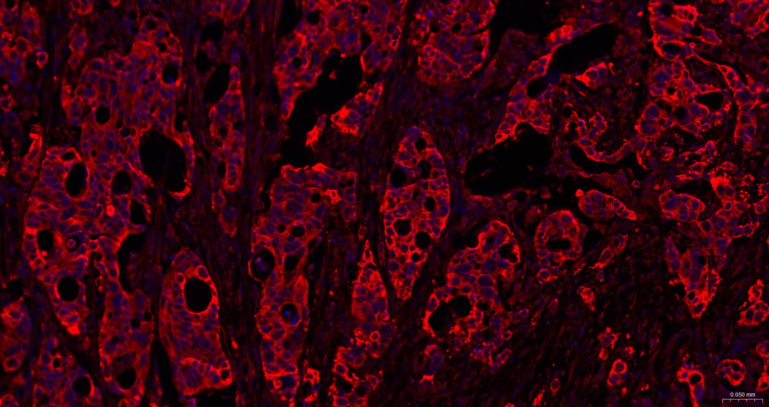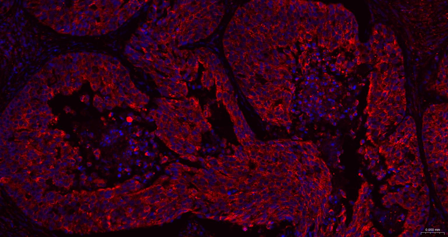 Paraformaldehyde-fixed, paraffin embedded Human Prostate Cancer; Antigen retrieval by boiling in sodium citrate buffer (pH6.0) for 15 min; The section was incubated with Bid Monoclonal Antibody, Unconjugated (bsm-61450R) at 1:200 overnight at 4°C. Followed by conjugated Goat Anti-Rabbit IgG antibody (Red, bs-0295G-BF594), DAPI (blue, C02-04002) was used to stain the cell nuclei.