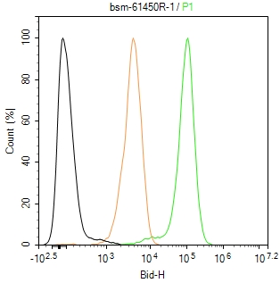 The Jurkat (H) cells were fixed with 4% PFA (10 min at r.t.) and then permeabilized with 90% ice-cold methanol for 20 min at -20℃,the cells then were incubated in 5%BSA to block non-specific protein-protein interactions (30 min at r.t.), followed by secondary antibody incubation for 40 min at room temperature. Primary Antibody (green):Rabbit Anti-Bid antibody (bsm-61450R,1:100); Isotype Control (orange): Rabbit IgG (bs-0295P). Blank control (black): PBS. Acquisition of 20,000 events was performed.