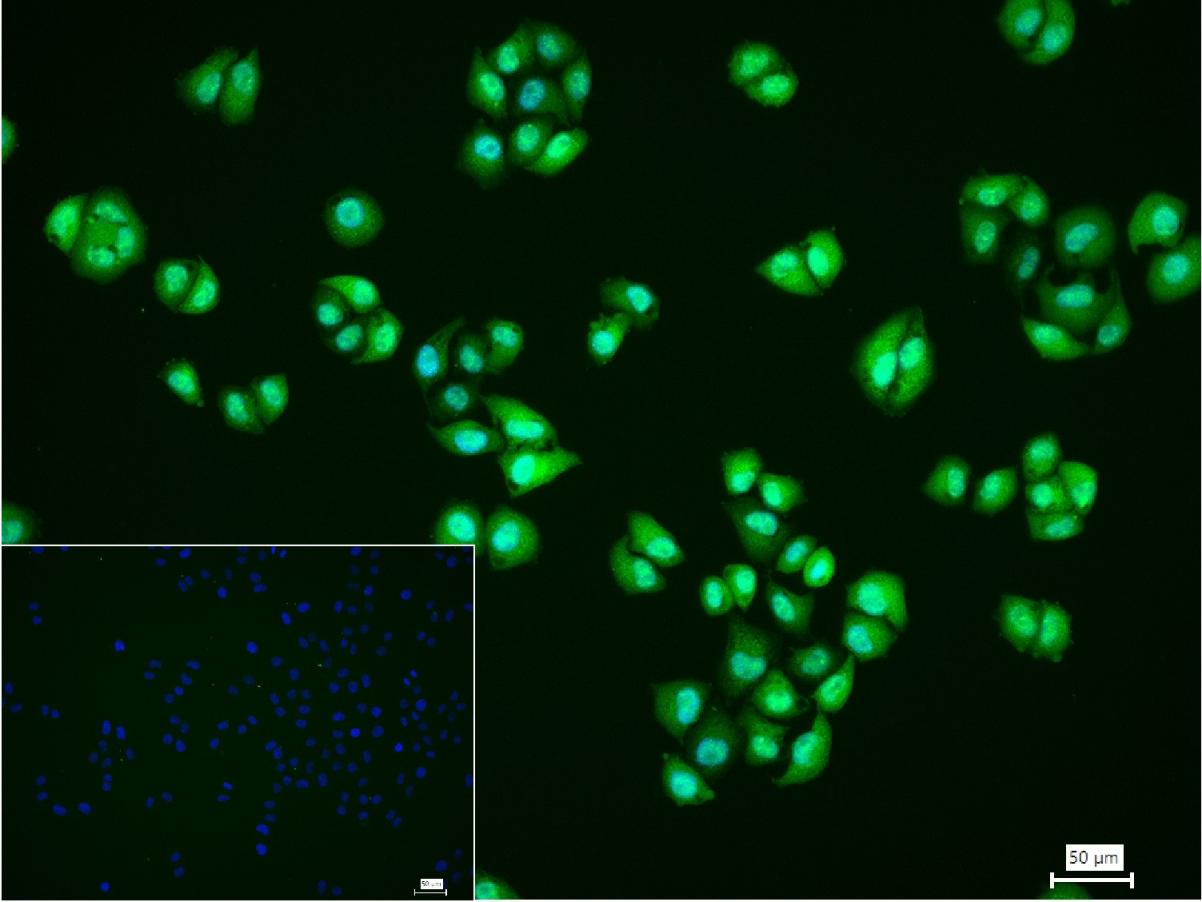 4% Paraformaldehyde-fixed Hela (H) cell; Triton X-100 at r.t. for 20 min; Antibody incubation with (VCP) monoclonal Antibody, unconjugated (bsm-61451R) 1:100, 90 min at 37°C; followed by conjugated Goat Anti-Rabbit IgG antibody (green, bs-40295G-FITC) at 37°C for 90 min, DAPI (blue, C02-04002) was used to stain the cell nuclei. PBS instead of the primary antibody was used as the blank control.