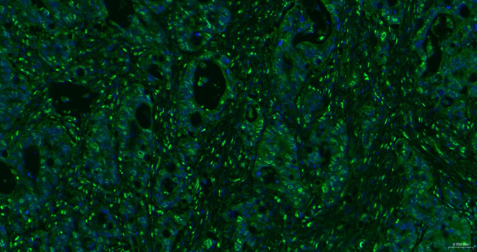 Paraformaldehyde-fixed, paraffin embedded Human Colon Cancer; Antigen retrieval by boiling in sodium citrate buffer (pH6.0) for 15 min; The section was incubated with VCP Monoclonal Antibody, Unconjugated (bsm-61451R) at 1:200 overnight at 4°C. Followed by conjugated Goat Anti-Rabbit IgG antibody (Green, bs-0295G-BF488), DAPI (blue, C02-04002) was used to stain the cell nuclei.