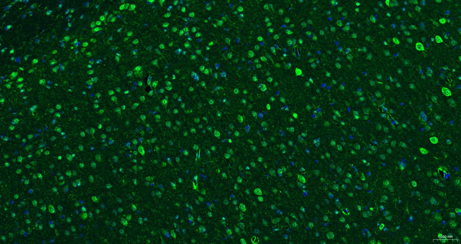 Paraformaldehyde-fixed, paraffin embedded Rat Cerebrum; Antigen retrieval by boiling in sodium citrate buffer (pH6.0) for 15 min; The section was incubated with VCP Monoclonal Antibody, Unconjugated (bsm-61451R) at 1:200 overnight at 4°C. Followed by conjugated Goat Anti-Rabbit IgG antibody (Green, bs-0295G-BF488), DAPI (blue, C02-04002) was used to stain the cell nuclei.