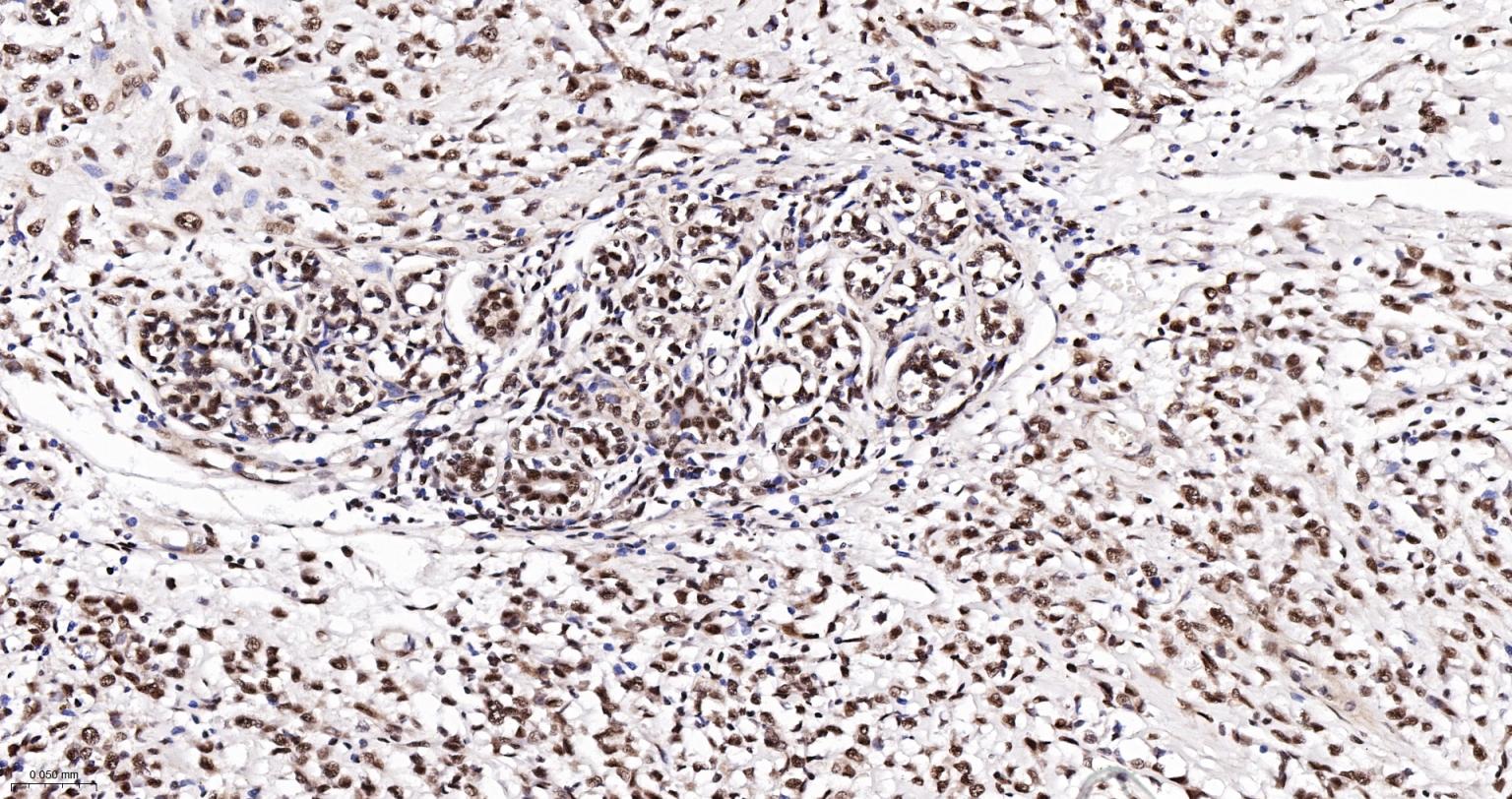 Paraformaldehyde-fixed, paraffin embedded Human Breast Cancer; Antigen retrieval by boiling in sodium citrate buffer (pH6.0) for 15 min; The section was incubated with Ku70 / XRCC6 Monoclonal Antibody, Unconjugated (bsm-61460R) at 1:200 overnight at 4°C, followed by conjugation to the bs-0295G-HRP and DAB (C-0010) staining.