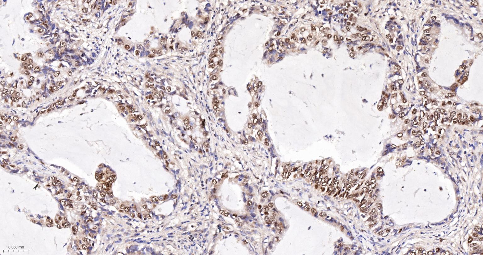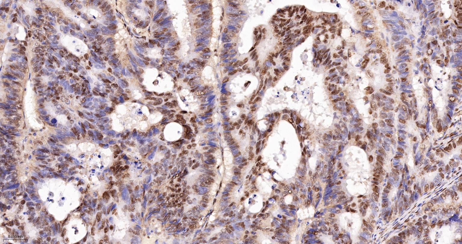 Paraformaldehyde-fixed, paraffin embedded Human Colon Cancer; Antigen retrieval by boiling in sodium citrate buffer (pH6.0) for 15 min; The section was incubated with Ku70 / XRCC6 Monoclonal Antibody, Unconjugated (bsm-61460R) at 1:200 overnight at 4°C, followed by conjugation to the bs-0295G-HRP and DAB (C-0010) staining.
