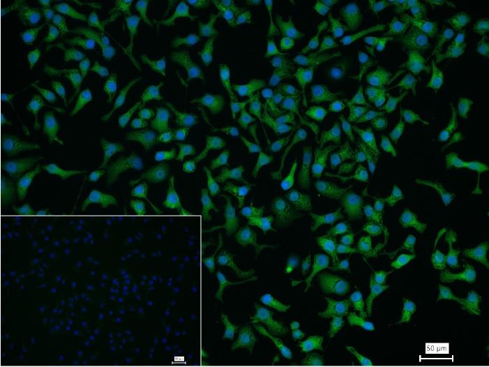 4% Paraformaldehyde-fixed HepG2 (H) cell; Triton X-100 at r.t. for 20 min; Antibody incubation with (GATA4) monoclonal Antibody, unconjugated (bsm-61462R) 1:100, 90 min at 37°C; followed by conjugated Goat Anti-Rabbit IgG antibody (green, bs-40295G-FITC) at 37°C for 90 min, DAPI (blue, C02-04002) was used to stain the cell nuclei. PBS instead of the primary antibody was used as the blank control.