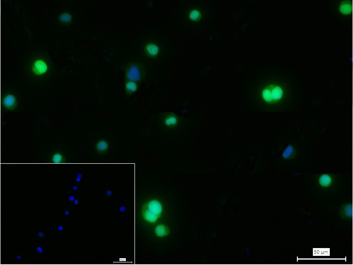 4% Paraformaldehyde-fixed K562 (H) cell; Triton X-100 at r.t. for 20 min; Antibody incubation with (XRCC1) monoclonal Antibody, unconjugated (bsm-61465R) 1:100, 90 min at 37°C; followed by conjugated Goat Anti-Rabbit IgG antibody (green, bs-40295G-FITC) at 37°C for 90 min, DAPI (blue, C02-04002) was used to stain the cell nuclei. PBS instead of the primary antibody was used as the blank control.