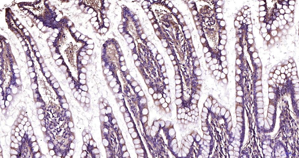 Paraformaldehyde-fixed, paraffin embedded Human small intestine; Antigen retrieval by boiling in sodium citrate buffer (pH6.0) for 15 min; Antibody incubation with SAA1 Monoclonal Antibody, Unconjugated (bsm-61468R) at 1:200 overnight at 4°C, followed by conjugation to the bs-0295G-HRP and DAB (C-0010) staining.