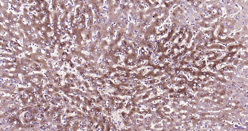 Paraformaldehyde-fixed, paraffin embedded Human liver; Antigen retrieval by boiling in sodium citrate buffer (pH6.0) for 15 min; Antibody incubation with SAA1 Monoclonal Antibody, Unconjugated (bsm-61468R) at 1:200 overnight at 4°C, followed by conjugation to the bs-0295G-HRP and DAB (C-0010) staining.
