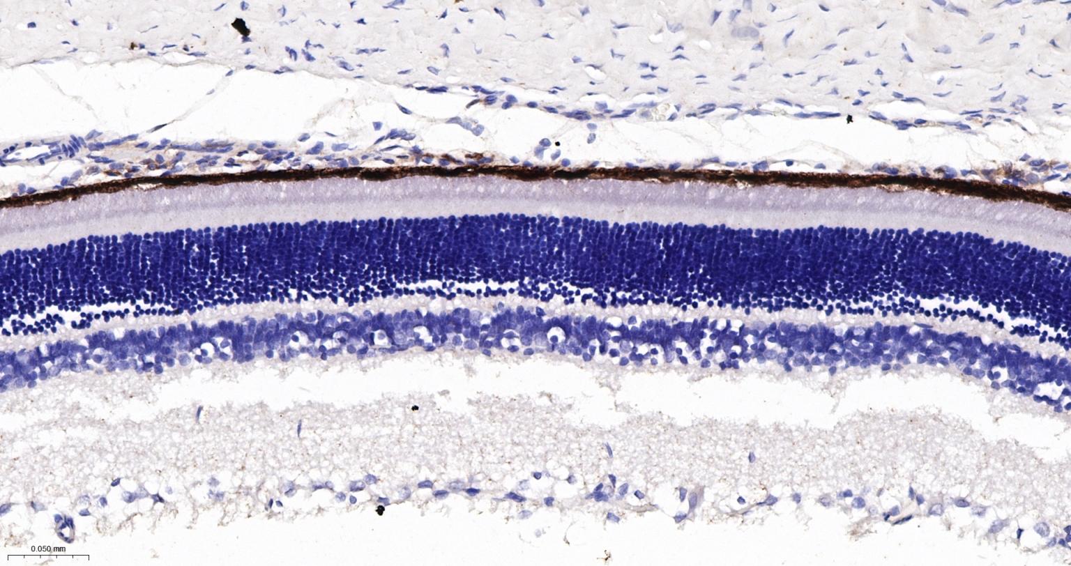 Paraformaldehyde-fixed, paraffin embedded Rat Eye; Antigen retrieval by boiling in sodium citrate buffer (pH6.0) for 15 min; The section was incubated with RPE65 Monoclonal Antibody, Unconjugated (bsm-61470R) at 1:200 overnight at 4°C, followed by conjugation to the bs-0295G-HRP and DAB (C-0010) staining.