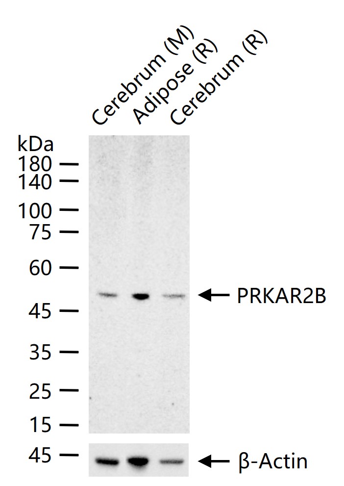 25 ug total protein per lane of various lysates (see on figure) probed with PRKAR2B monoclonal antibody, unconjugated (bsm-61473R) at 1:1000 dilution and 4°C overnight incubation. Followed by conjugated secondary antibody incubation at r.t. for 60 min.
