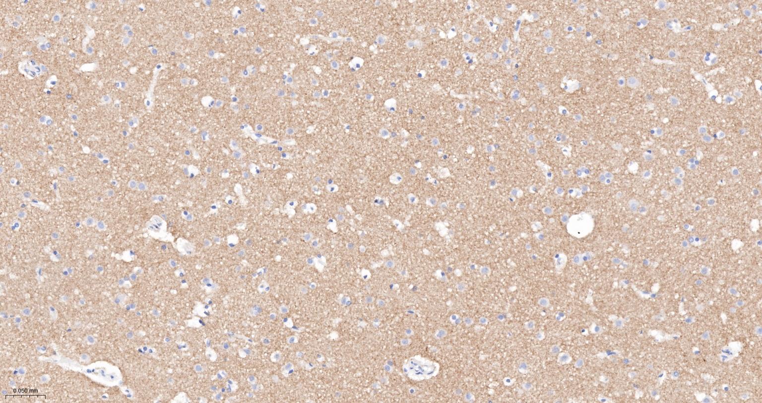 Paraformaldehyde-fixed, paraffin embedded Human Cerebrum; Antigen retrieval by boiling in sodium citrate buffer (pH6.0) for 15 min; The section was incubated with PRKAR2B Monoclonal Antibody, Unconjugated (bsm-61473R) at 1:200 overnight at 4°C, followed by conjugation to the bs-0295G-HRP and DAB (C-0010) staining.