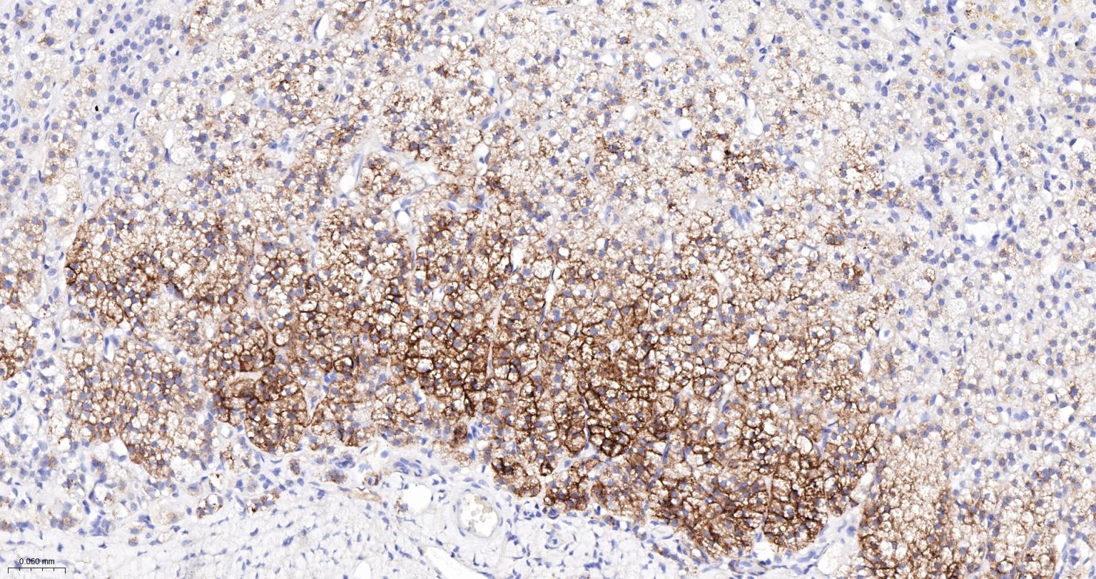 Paraformaldehyde-fixed, paraffin embedded Human Adrenal Gland; Antigen retrieval by boiling in sodium citrate buffer (pH6.0) for 15 min; The section was incubated with PRKAR2B Monoclonal Antibody, Unconjugated (bsm-61473R) at 1:200 overnight at 4°C, followed by conjugation to the bs-0295G-HRP and DAB (C-0010) staining.