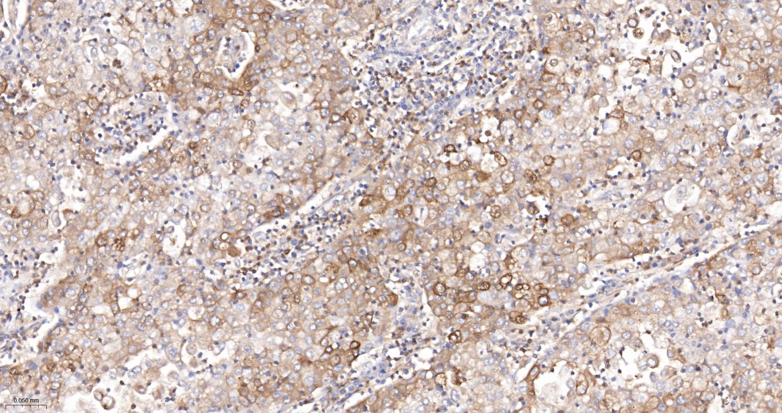 Paraformaldehyde-fixed, paraffin embedded Human Liver Cancer; Antigen retrieval by boiling in sodium citrate buffer (pH6.0) for 15 min; The section was incubated with Glucose 6 Phosphate Dehydrogenase Monoclonal Antibody, Unconjugated (bsm-61479R) at 1:200 overnight at 4°C, followed by conjugation to the bs-0295G-HRP and DAB (C-0010) staining.