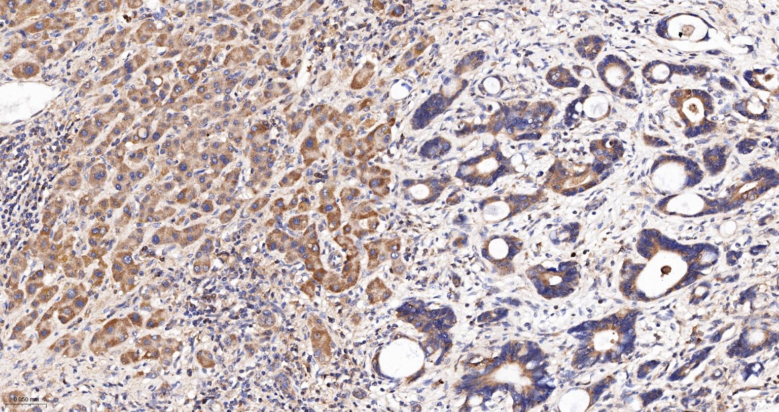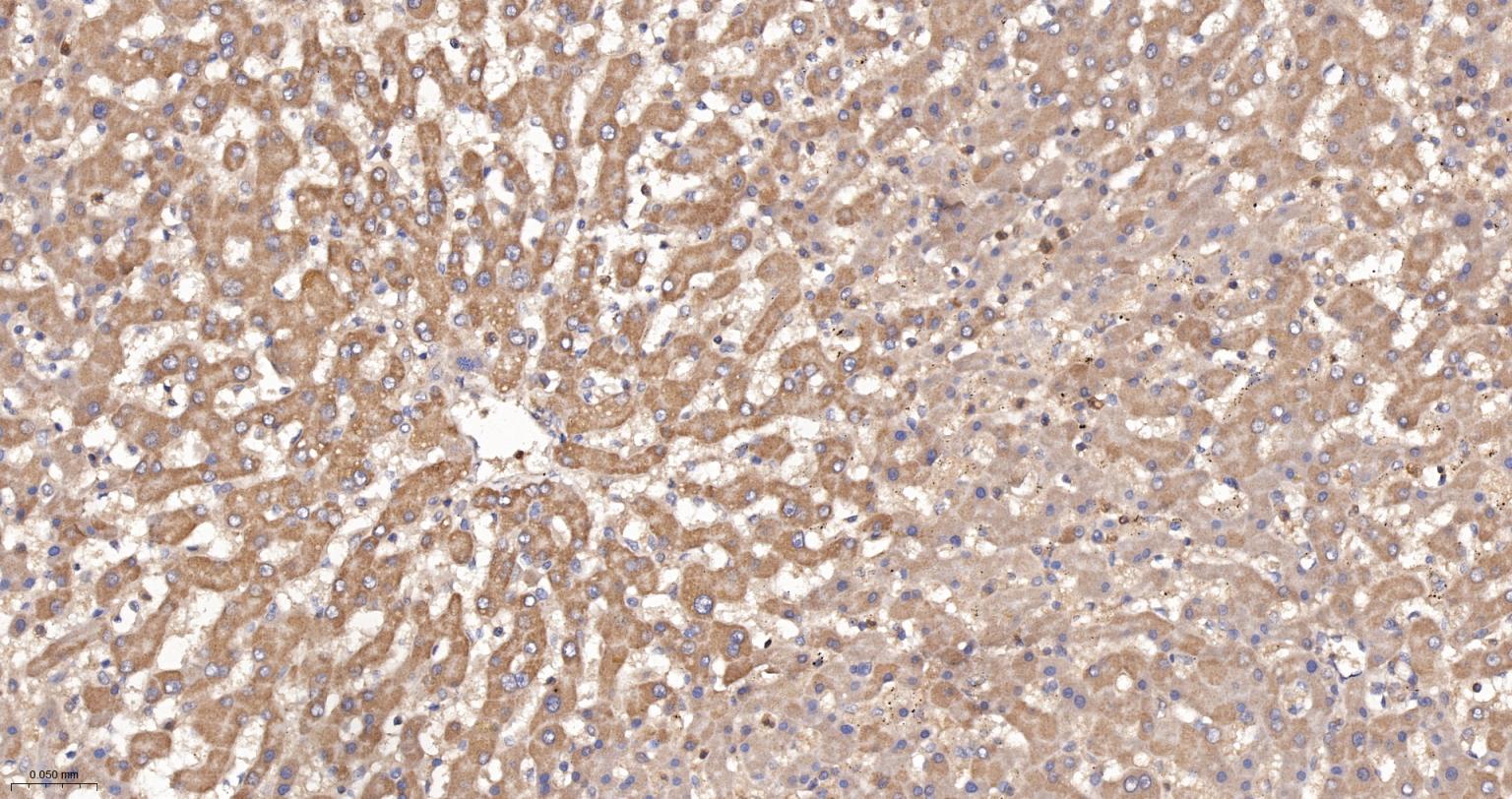 Paraformaldehyde-fixed, paraffin embedded Human Liver; Antigen retrieval by boiling in sodium citrate buffer (pH6.0) for 15 min; Antibody incubation Glucose 6 Phosphate Dehydrogenase Monoclonal Antibody, Unconjugated(bsm-61479R) at 1:200 overnight at 4°C, followed by conjugation to the bs-0295G-HRP and DAB (C-0010) staining.