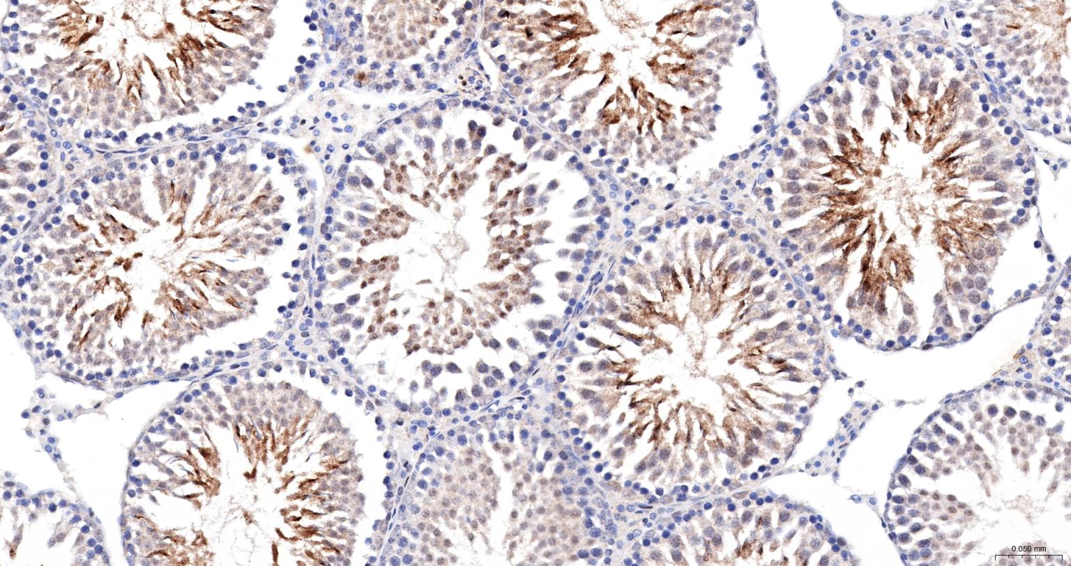 Paraformaldehyde-fixed, paraffin embedded Rat Testicles; Antigen retrieval by boiling in sodium citrate buffer (pH6.0) for 15 min; The section was incubated with Drosha Monoclonal Antibody, Unconjugated (bsm-61492R) at 1:200 overnight at 4°C, followed by conjugation to the bs-0295G-HRP and DAB (C-0010) staining.