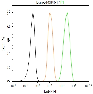 The HeLa (H) cells were fixed with 4% PFA (10 min at r.t.) and then permeabilized with 90% ice-cold methanol for 20 min at -20℃,the cells then were incubated in 5%BSA to block non-specific protein-protein interactions (30 min at r.t.), followed by secondary antibody incubation for 40 min at room temperature. Primary Antibody (green):Rabbit Anti-BubR1 antibody (bsm-61498R,1:100); Isotype Control (orange): Rabbit IgG (bs-0295P). Blank control (black): PBS. Acquisition of 20,000 events was performed.