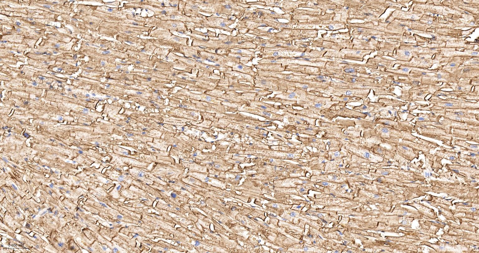 Paraformaldehyde-fixed, paraffin embedded Human Heart; Antigen retrieval by boiling in sodium citrate buffer (pH6.0) for 15 min; The section was incubated with gamma Sarcoglycan Monoclonal Antibody, Unconjugated (bsm-61504R) at 1:200 overnight at 4°C, followed by conjugation to the bs-0295G-HRP and DAB (C-0010) staining.