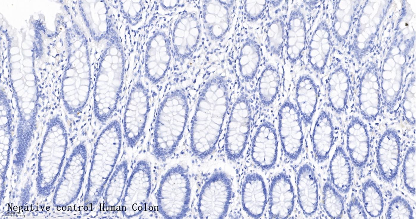 (Negative control) Paraformaldehyde-fixed, paraffin embedded Human Colon; Antigen retrieval by boiling in sodium citrate buffer (pH6.0) for 15 min; The section was incubated with gamma Sarcoglycan Monoclonal Antibody, Unconjugated (bsm-61504R) at 1:200 overnight at 4°C, followed by conjugation to the bs-0295G-HRP and DAB (C-0010) staining.