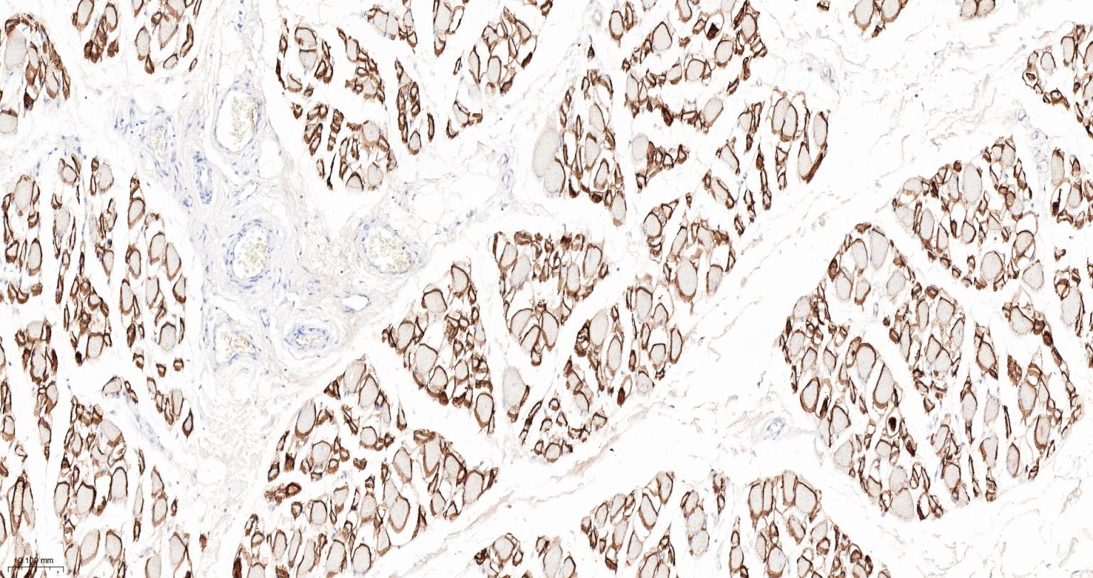 Paraformaldehyde-fixed, paraffin embedded Human Skeletal muscle; Antigen retrieval by boiling in sodium citrate buffer (pH6.0) for 15 min; The section was incubated with gamma Sarcoglycan Monoclonal Antibody, Unconjugated (bsm-61504R) at 1:200 overnight at 4°C, followed by conjugation to the bs-0295G-HRP and DAB (C-0010) staining.