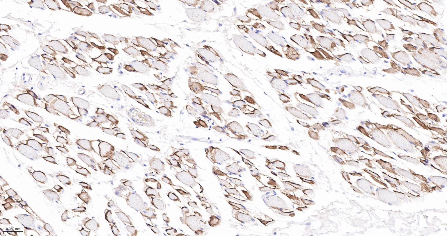 Paraformaldehyde-fixed, paraffin embedded Human Skeletal muscle; Antigen retrieval by boiling in sodium citrate buffer (pH6.0) for 15 min; The section was incubated with delta Sarcoglycan Monoclonal Antibody, Unconjugated (bsm-61506R) at 1:200 overnight at 4°C, followed by conjugation to the bs-0295G-HRP and DAB (C-0010) staining.