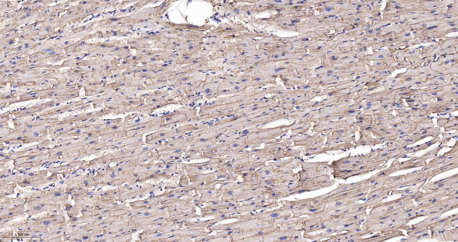 Paraformaldehyde-fixed, paraffin embedded Human Heart; Antigen retrieval by boiling in sodium citrate buffer (pH6.0) for 15 min; The section was incubated with delta Sarcoglycan Monoclonal Antibody, Unconjugated (bsm-61506R) at 1:200 overnight at 4°C, followed by conjugation to the bs-0295G-HRP and DAB (C-0010) staining.