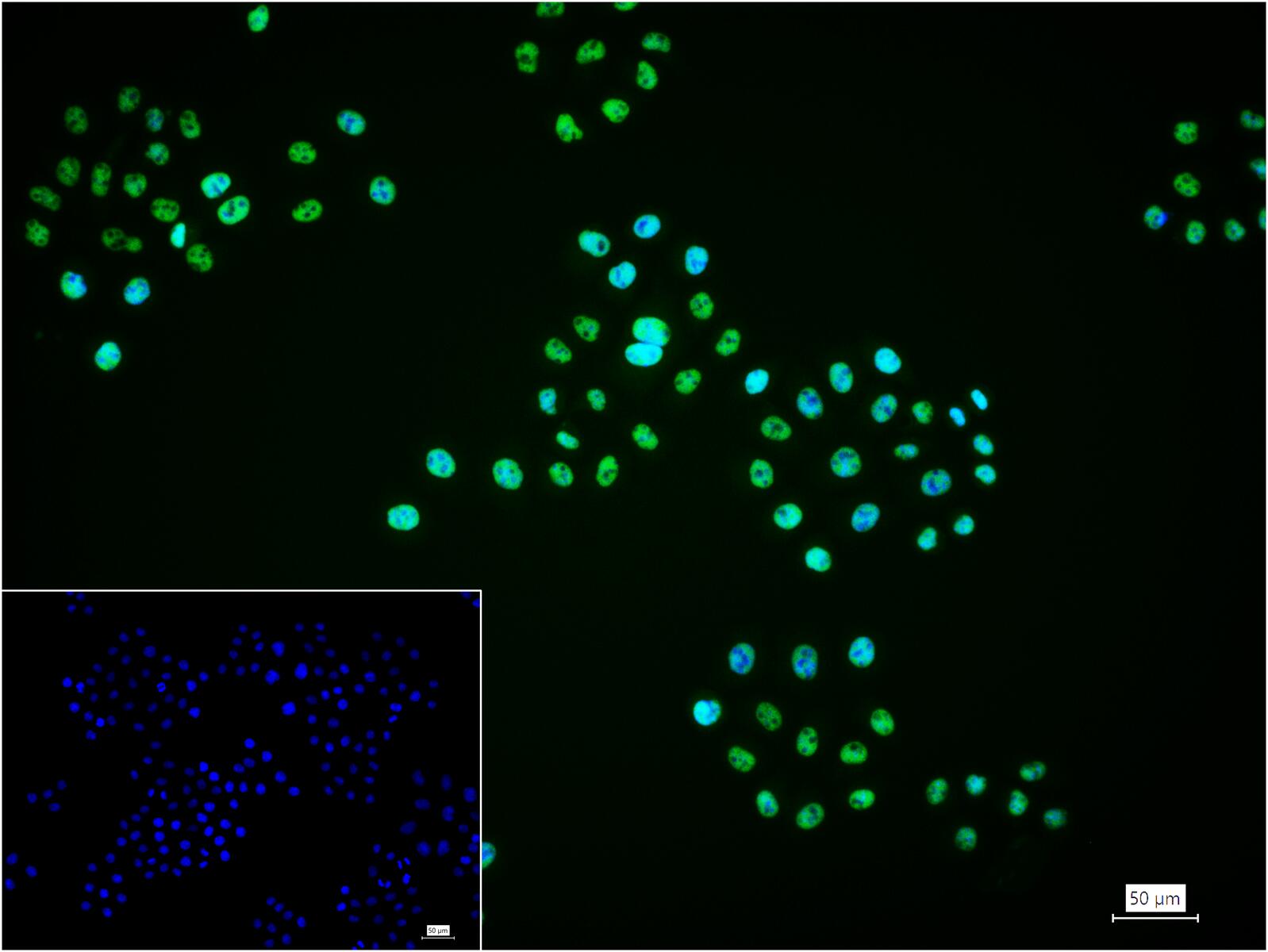 4% Paraformaldehyde-fixed HeLa (H) cell; Triton X-100 at r.t. for 20 min; Antibody incubation with (MTA2) monoclonal Antibody, unconjugated (bsm-61524R) 1:100, 90 min at 37°C; followed by BF488 conjugated Goat Anti-Rabbit IgG antibody (green, bs-60295G-BF488) at 37°C for 90 min, DAPI (blue, C02-04002) was used to stain the cell nuclei. PBS instead of the primary antibody was used as the blank control.