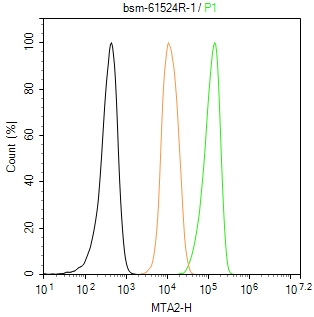 The HeLa (H) cells were fixed with 4% PFA (10 min at r.t.) and then permeabilized with 90% ice-cold methanol for 20 min at -20℃,the cells then were incubated in 5%BSA to block non-specific protein-protein interactions (30 min at r.t.), followed by secondary antibody incubation for 40 min at room temperature. Primary Antibody (green):Rabbit Anti-MTA2 antibody (bsm-61524R,1:100); Isotype Control (orange): Rabbit IgG (bs-0295P). Blank control (black): PBS. Acquisition of 20,000 events was performed.