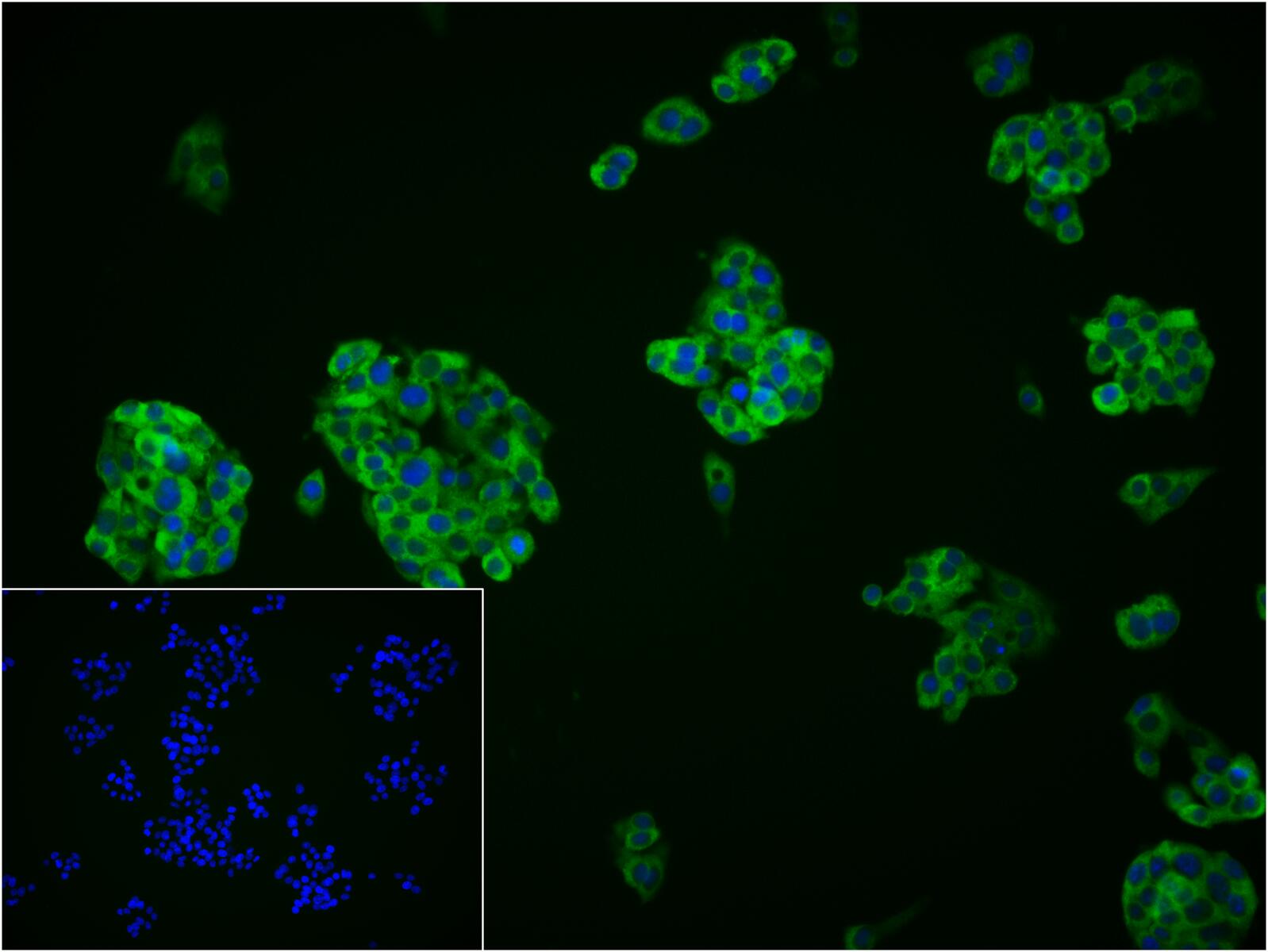4% Paraformaldehyde-fixed HepG2 (H) cell; Triton X-100 at r.t. for 20 min; Antibody incubation with (Staufen) monoclonal Antibody, unconjugated (bsm-61532R) 1:100, 90 min at 37°C; followed by BF488 conjugated Goat Anti-Rabbit IgG antibody (green, bs-60295G-BF488) at 37°C for 90 min, DAPI (blue, C02-04002) was used to stain the cell nuclei. PBS instead of the primary antibody was used as the blank control.