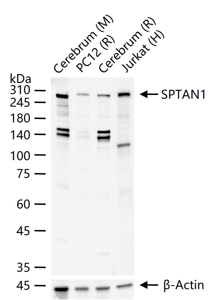 25 ug total protein per lane of various lysates (see on figure) probed with SPTAN1 monoclonal antibody, unconjugated (bsm-61537R) at 1:1000 dilution and 4°C overnight incubation. Followed by conjugated secondary antibody incubation at r.t. for 60 min.