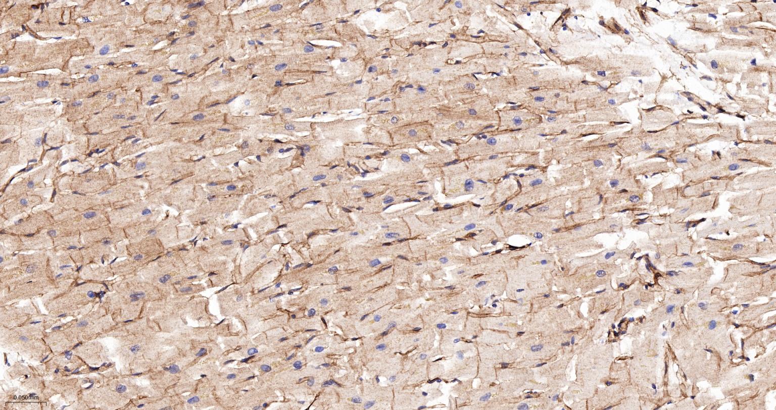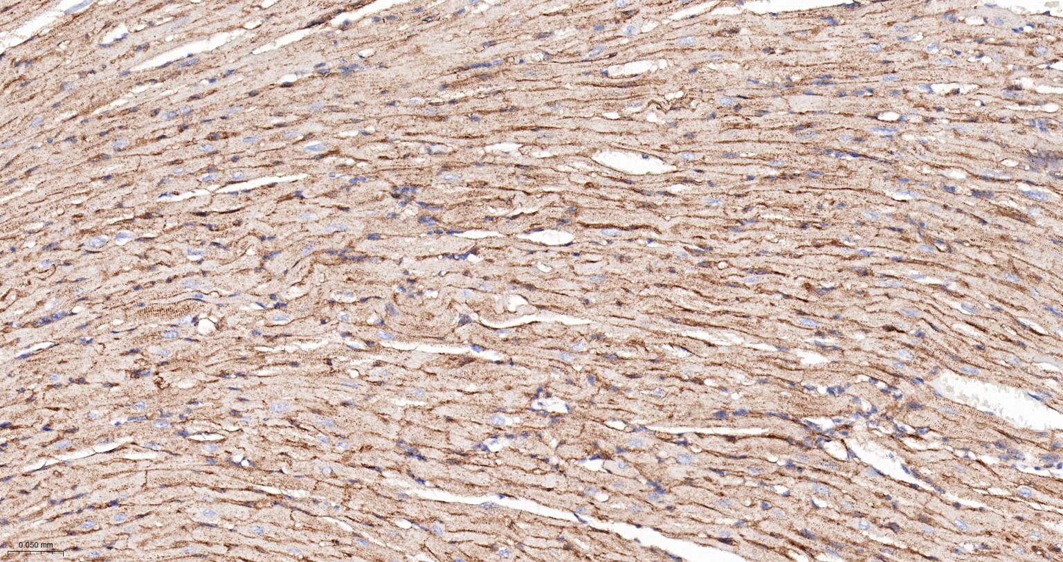 Paraformaldehyde-fixed, paraffin embedded Rat Heart; Antigen retrieval by boiling in sodium citrate buffer (pH6.0) for 15 min; The section was incubated with SPECA Recombinant Monoclonal Antibody, Unconjugated (bsm-61537R) at 1:200 overnight at 4°C, followed by conjugation to the bs-0295G-HRP and DAB (C-0010) staining.