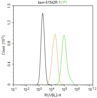 The Hela (H) cells were fixed with 4% PFA (10 min at r.t.) and then permeabilized with 90% ice-cold methanol for 20 min at -20℃,the cells then were incubated in 5%BSA to block non-specific protein-protein interactions (30 min at r.t.), followed by secondary antibody incubation for 40 min at room temperature. Primary Antibody (green):Rabbit Anti-RUVBL2 antibody (bsm-61542R,1:100); Isotype Control (orange): Rabbit IgG (bs-0295P). Blank control (black): PBS. Acquisition of 20,000 events was performed.