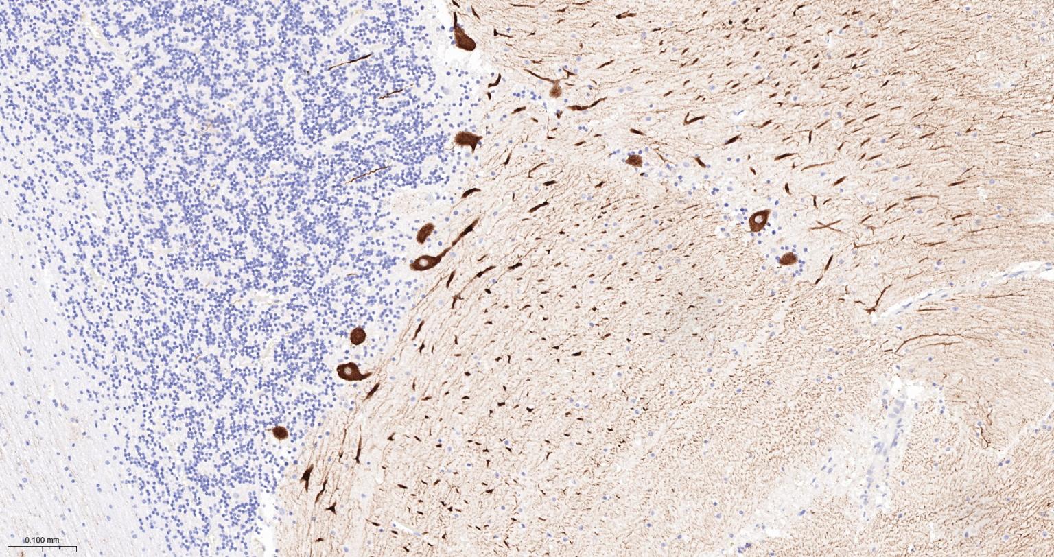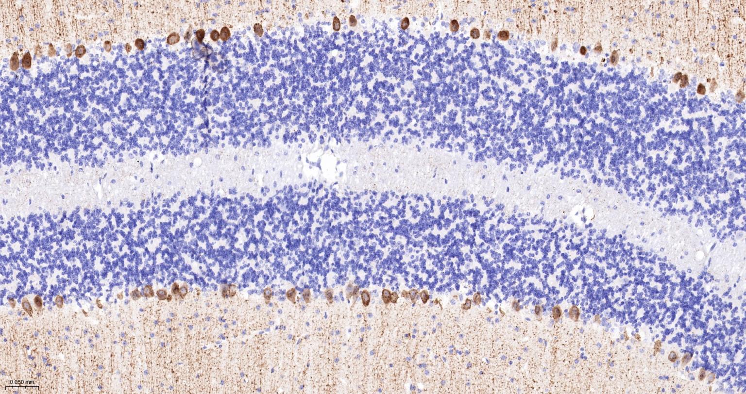 Paraformaldehyde-fixed, paraffin embedded Rat Cerebellum; Antigen retrieval by boiling in sodium citrate buffer (pH6.0) for 15 min; Antibody incubation with IP3 receptor Monoclonal Antibody, Unconjugated(bsm-61555R) at 1:200 overnight at 4°C, followed by conjugation to the bs-0295G-HRP and DAB (C-0010) staining.