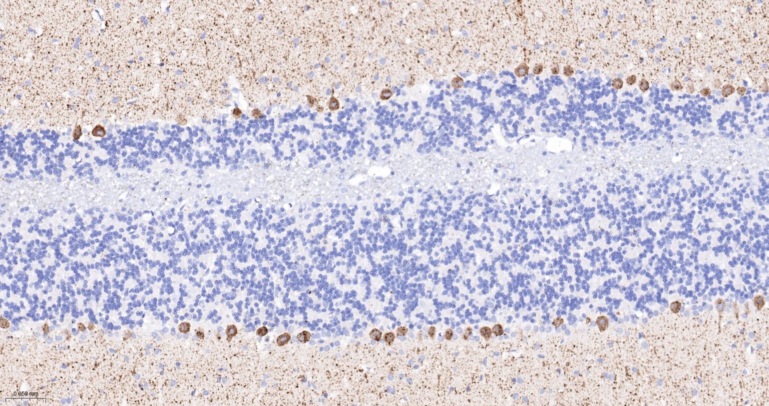 Paraformaldehyde-fixed, paraffin embedded Mouse Cerebellum; Antigen retrieval by boiling in sodium citrate buffer (pH6.0) for 15 min; Antibody incubation with IP3 receptor Monoclonal Antibody, Unconjugated(bsm-61555R) at 1:200 overnight at 4°C, followed by conjugation to the bs-0295G-HRP and DAB (C-0010) staining.