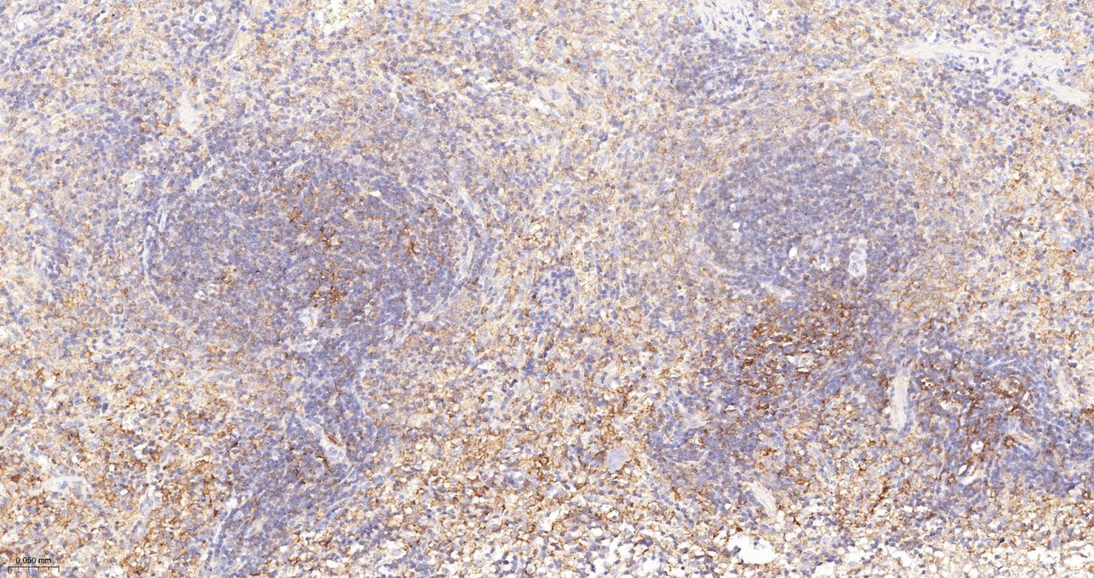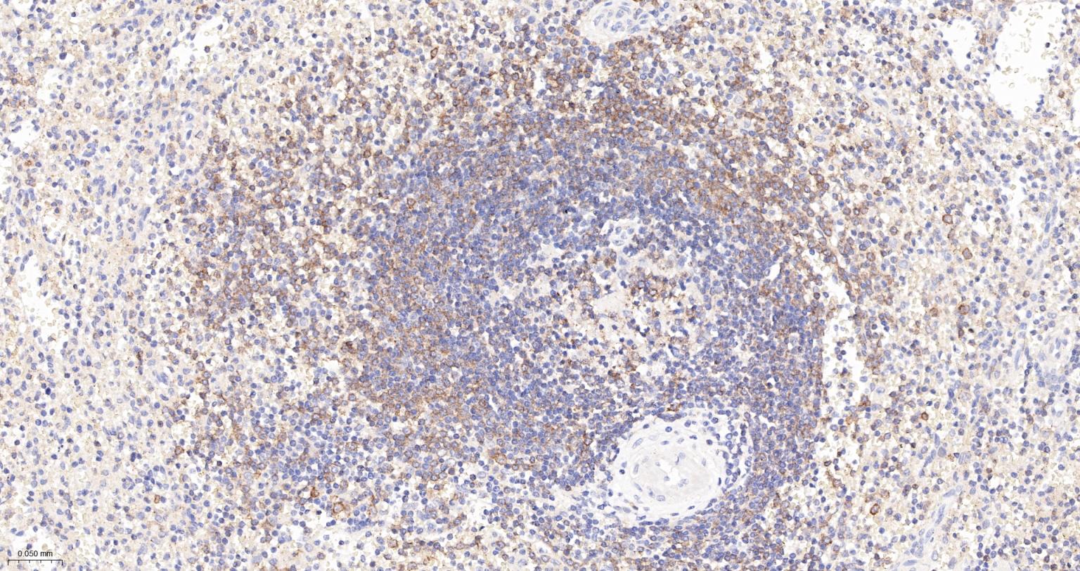 Paraformaldehyde-fixed, paraffin embedded Human Spleen; Antigen retrieval by boiling in sodium citrate buffer (pH6.0) for 15 min; The section was incubated with IP3 receptor Monoclonal Antibody, Unconjugated (bsm-61555R) at 1:200 overnight at 4°C, followed by conjugation to the bs-0295G-HRP and DAB (C-0010) staining.