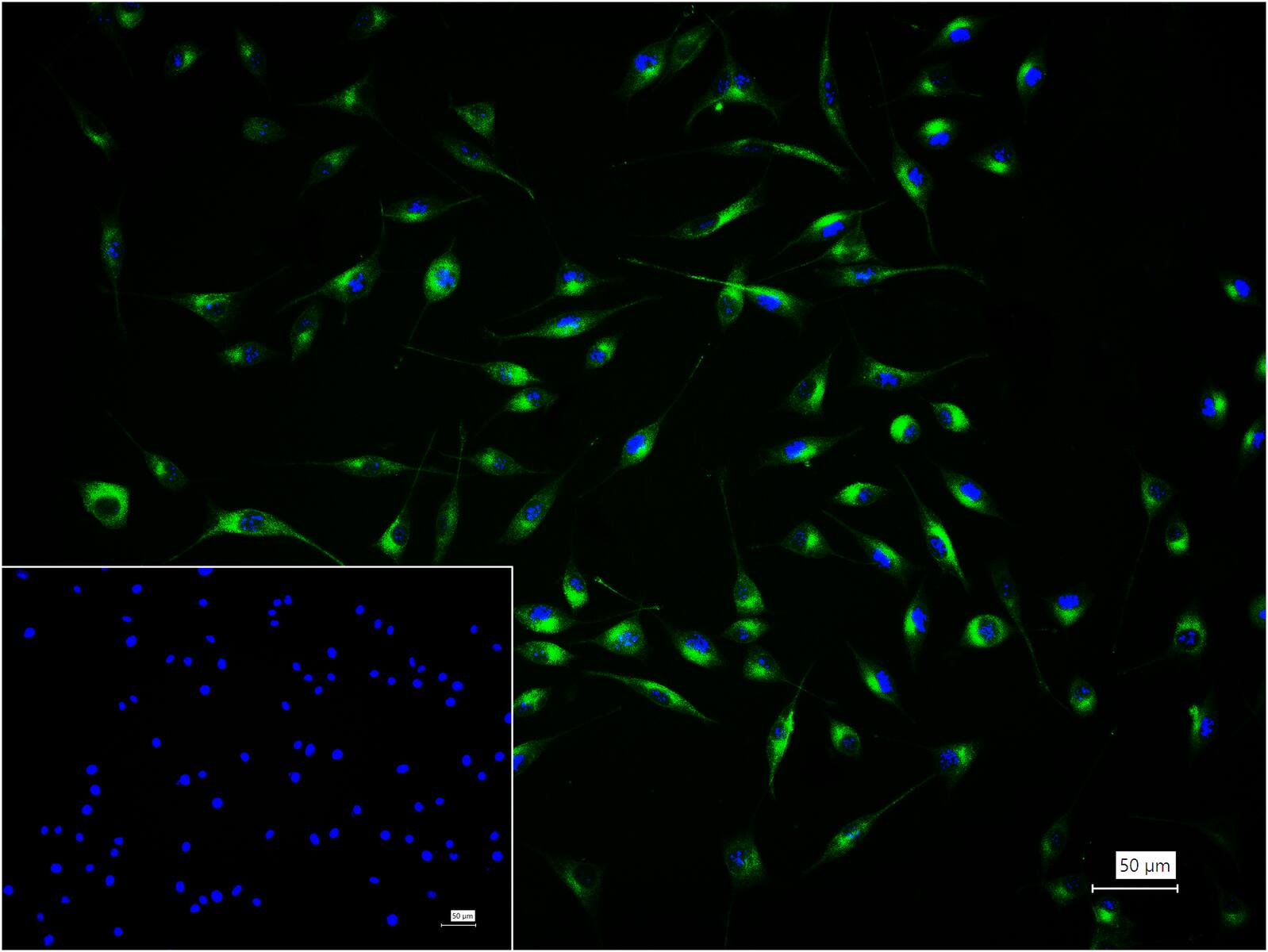 4% Paraformaldehyde-fixed SH-SY5Y (H) cell; Triton X-100 at r.t. for 20 min; Antibody incubation with (IP3 receptor) monoclonal Antibody, unconjugated (bsm-61555R) 1:100, 90 min at 37°C; followed by BF488 conjugated Goat Anti-Rabbit IgG antibody (green, bs-60295G-BF488) at 37°C for 90 min, DAPI (blue, C02-04002) was used to stain the cell nuclei. PBS instead of the primary antibody was used as the blank control.