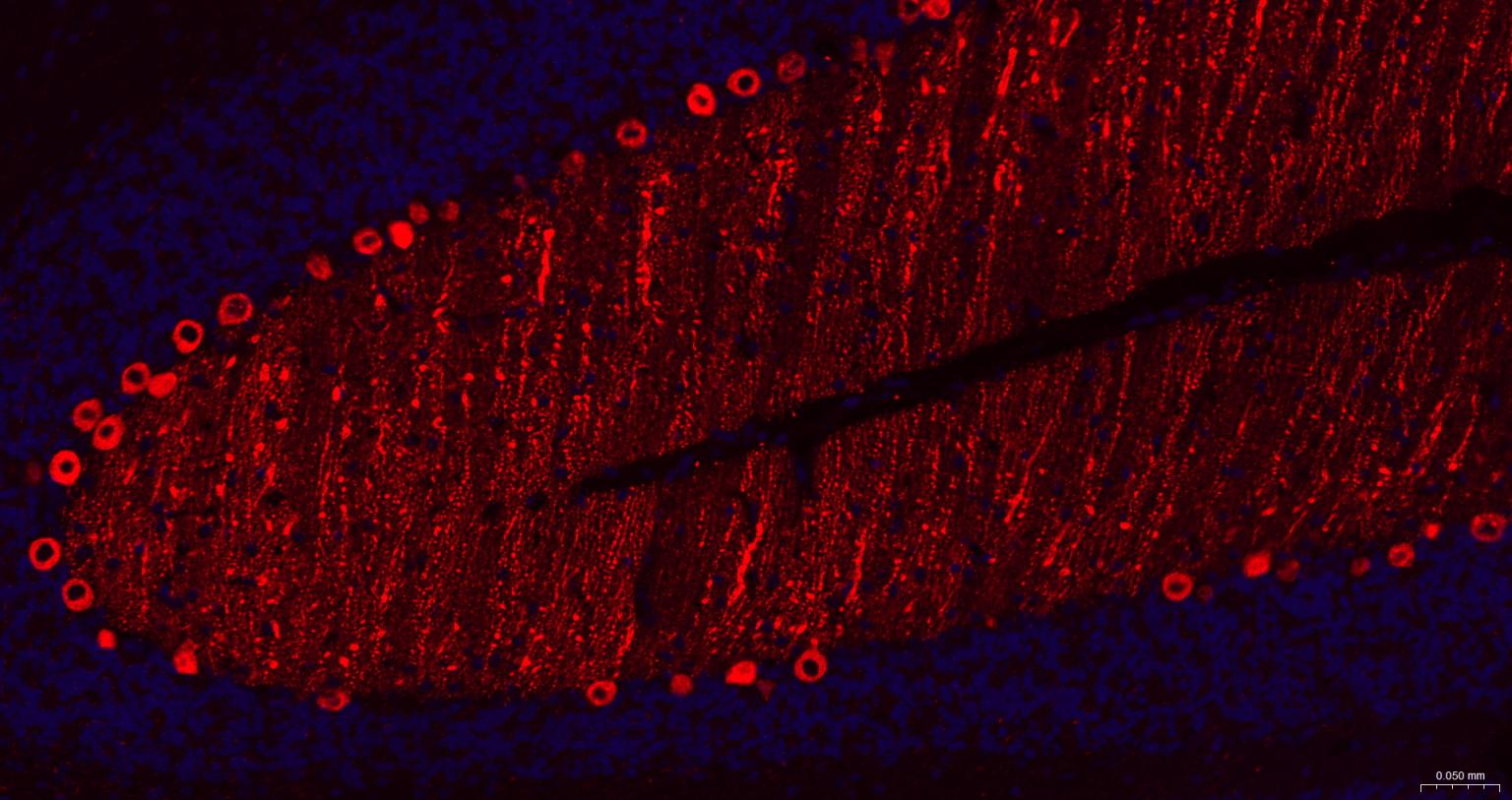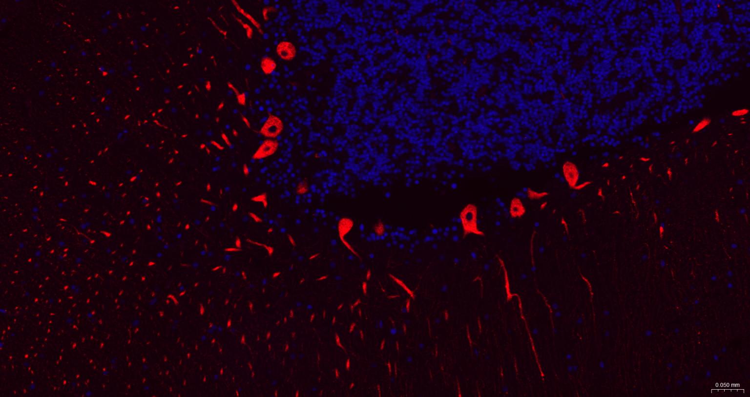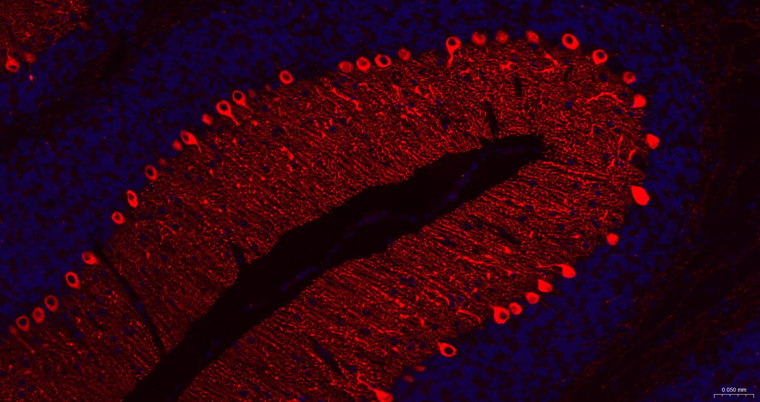 Paraformaldehyde-fixed, paraffin embedded Mouse Cerebellum; Antigen retrieval by boiling in sodium citrate buffer (pH6.0) for 15 min; The section was incubated with IP3 Monoclonal Antibody, Unconjugated (bsm-61555R) at 1:200 overnight at 4°C. Followed by conjugated Goat Anti-Rabbit IgG antibody (Red, bs-0295G-BF594), DAPI (blue, C02-04002) was used to stain the cell nuclei.