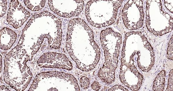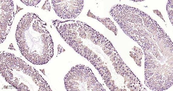 Paraformaldehyde-fixed, paraffin embedded Rat Testicles; Antigen retrieval by boiling in sodium citrate buffer (pH6.0) for 15 min; Antibody incubation with TXNRD1 Monoclonal Antibody, Unconjugated(bsm-61558R) at 1:200 overnight at 4°C, followed by conjugation to the bs-0295G-HRP and DAB (C-0010) staining.