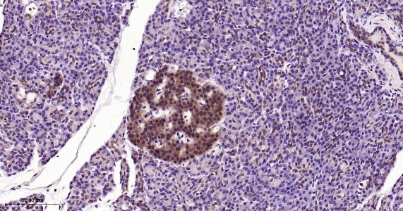 Paraformaldehyde-fixed, paraffin embedded Rat Pancreas; Antigen retrieval by boiling in sodium citrate buffer (pH6.0) for 15 min; Antibody incubation with TXNRD1 Monoclonal Antibody, Unconjugated(bsm-61558R) at 1:200 overnight at 4°C, followed by conjugation to the bs-0295G-HRP and DAB (C-0010) staining.