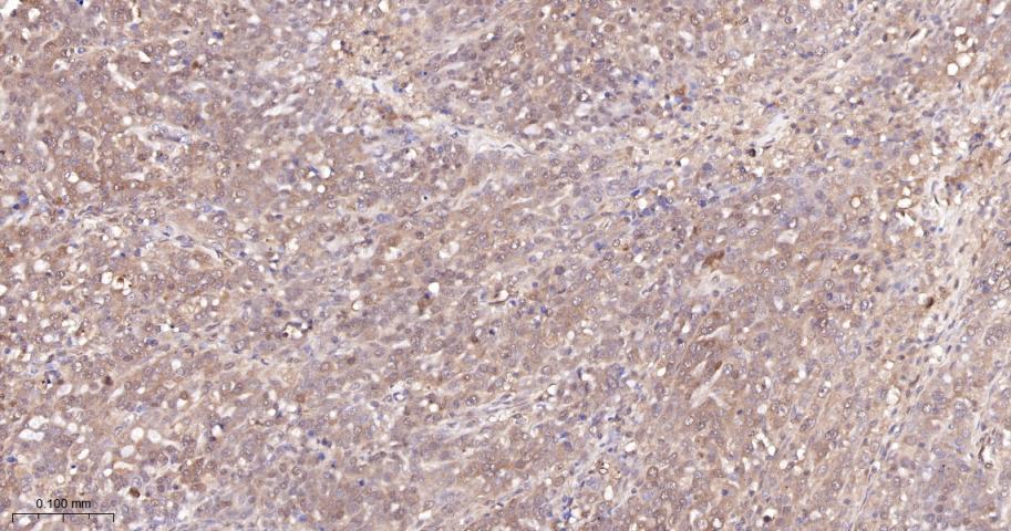 Paraformaldehyde-fixed, paraffin embedded Human Ovarian Cancert; Antigen retrieval by boiling in sodium citrate buffer (pH6.0) for 15 min; Antibody incubation with TXNRD1 Monoclonal Antibody, Unconjugated(bsm-61558R) at 1:200 overnight at 4°C, followed by conjugation to the bs-0295G-HRP and DAB (C-0010) staining.