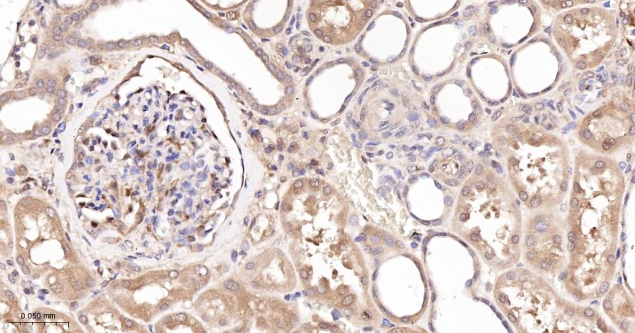 Paraformaldehyde-fixed, paraffin embedded Human Kidney; Antigen retrieval by boiling in sodium citrate buffer (pH6.0) for 15 min; Antibody incubation with TXNRD1 Monoclonal Antibody, Unconjugated(bsm-61558R) at 1:200 overnight at 4°C, followed by conjugation to the bs-0295G-HRP and DAB (C-0010) staining.