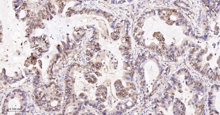 Paraformaldehyde-fixed, paraffin embedded Human Lung Cancer; Antigen retrieval by boiling in sodium citrate buffer (pH6.0) for 15 min; The section was incubated with TXNRD1 Monoclonal Antibody, Unconjugated (bsm-61558R) at 1:200 overnight at 4°C, followed by conjugation to the bs-0295G-HRP and DAB (C-0010) staining.