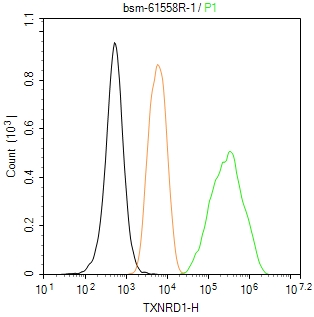 The A549 (H) cells were fixed with 4% PFA (10 min at r.t.) and then permeabilized with 90% ice-cold methanol for 20 min at -20℃,the cells then were incubated in 5%BSA to block non-specific protein-protein interactions (30 min at r.t.), followed by secondary antibody incubation for 40 min at room temperature. Primary Antibody (green):Rabbit Anti-TXNRD1 antibody (bsm-61558R): 1 μg/10^6 cells; Isotype Control (orange): Rabbit IgG (bs-0295P). Blank control (black): PBS. Acquisition of 20,000 events was performed.