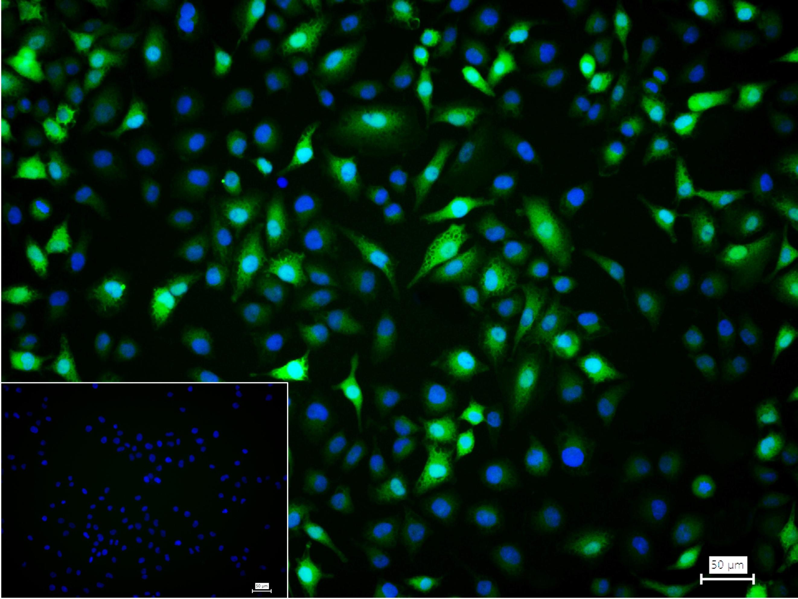 4% Paraformaldehyde-fixed A549 (H) cell; Triton X-100 at r.t. for 20 min; Antibody incubation with (TXNRD1) monoclonal Antibody, unconjugated (bsm-61558R) 1:100, 90 min at 37°C; followed by conjugated Goat Anti-Rabbit IgG antibody (green, bs-60295G-BF488) at 37°C for 90 min, DAPI (blue, C02-04002) was used to stain the cell nuclei. PBS instead of the primary antibody was used as the blank control.