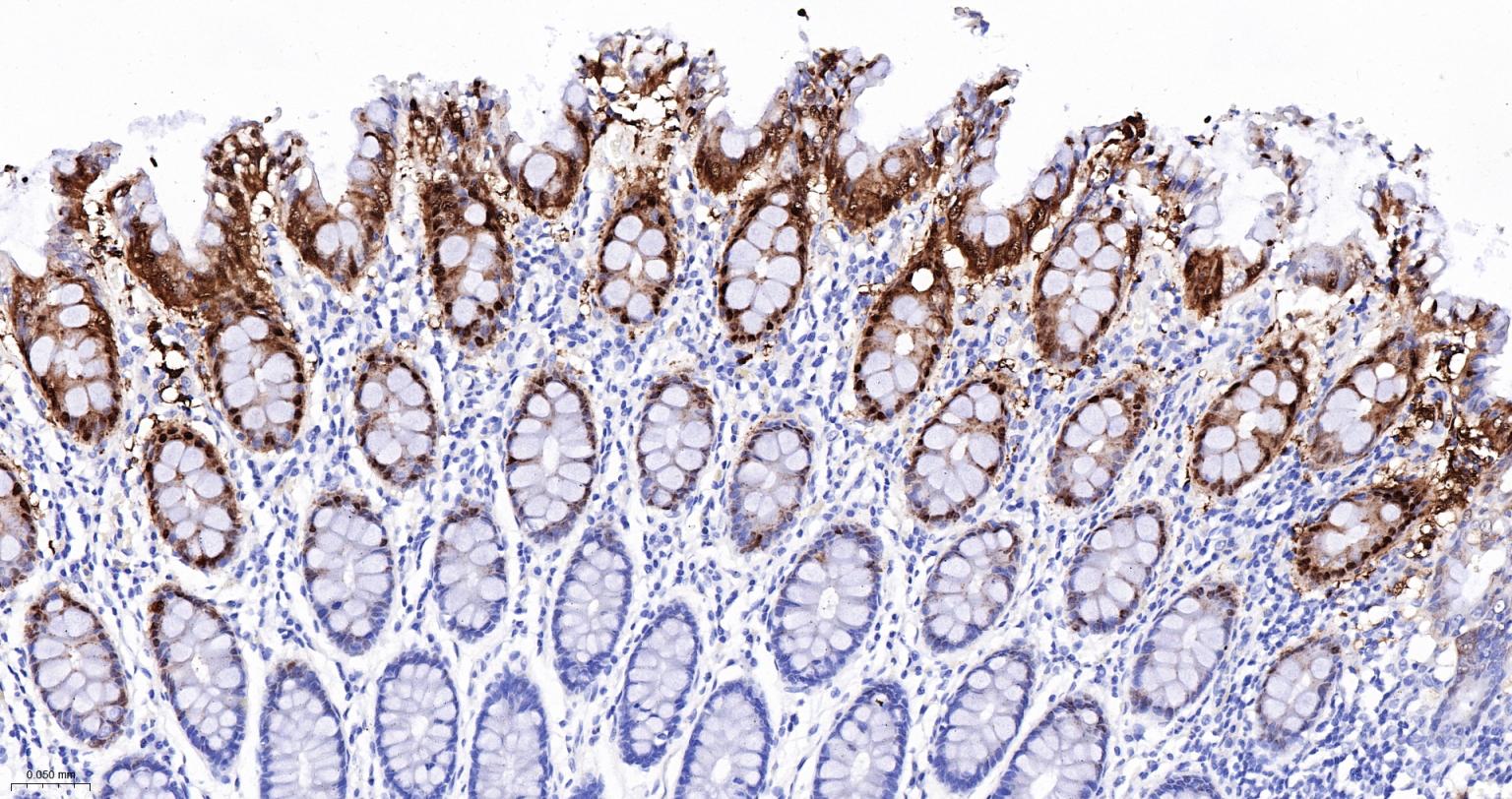 Paraformaldehyde-fixed, paraffin embedded Rat Colon; Antigen retrieval by boiling in sodium citrate buffer (pH6.0) for 15 min; The section was incubated with CA II Monoclonal Antibody, Unconjugated (bsm-61561R) at 1:200 overnight at 4°C, followed by conjugation to the bs-0295G-HRP and DAB (C-0010) staining.