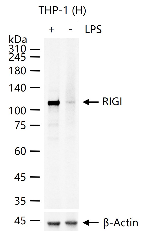 THP-1 (H) cells were treated with or without LPS (1ug/ml) for overnight, 25 μg total protein per lane of cell lysates (see on figure) probed with RIGI monoclonal antibody, unconjugated (bsm-61573R) at 1:1000 dilution and 4°C overnight incubation. Followed by conjugated secondary antibody incubation at r.t. for 60 min.