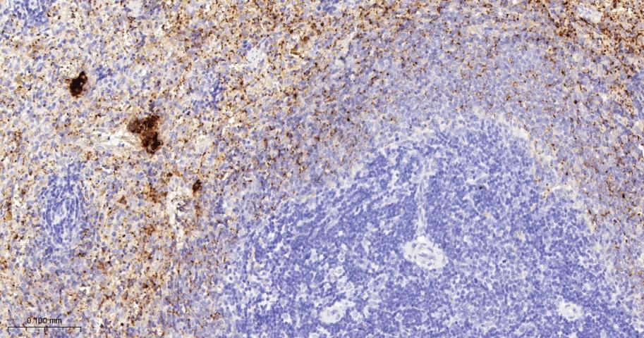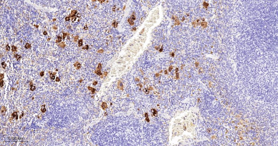Paraformaldehyde-fixed, paraffin embedded Human Spleen; Antigen retrieval by boiling in sodium citrate buffer (pH6.0) for 15 min; The section was incubated with CXCL4 Monoclonal Antibody, Unconjugated (bsm-61577R) at 1:200 overnight at 4°C, followed by conjugation to the bs-0295G-HRP and DAB (C-0010) staining.